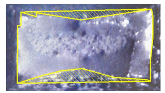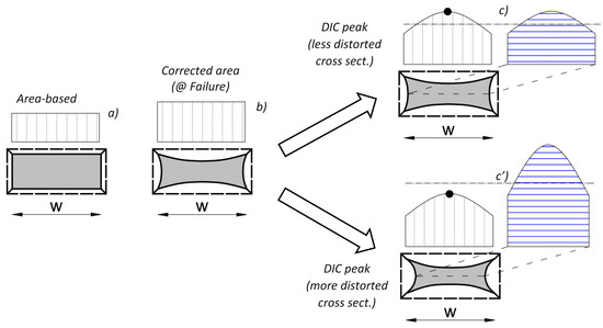 The magnitude of the maximum approximation of Equation (5) at failure is evaluated by assessing the effective resisting area as the difference between the gross rectangular area and the dashed area as in Figure 7. After the images of the broken specimen are imported in a CAD environment and are properly scaled, polygons are drawn for approximating the fracture surfaces, and the corresponding areas are then delivered by simple pixels-counting functions.