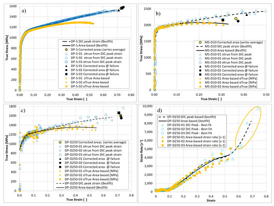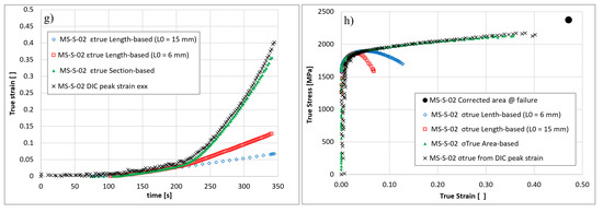 Figure 16 reports the true curves from the dynamic tests on the DP1000 and the MS1700 steels, while Table 4 reports the strains at the onset of diffused necking (εNeck) and localized necking (εLoc-Neck) calculated from the slopes of the stress–strain curves (respectively, according to the conditions and ), together with the failure strains according to the corrected-area and the DIC peak approaches.