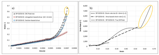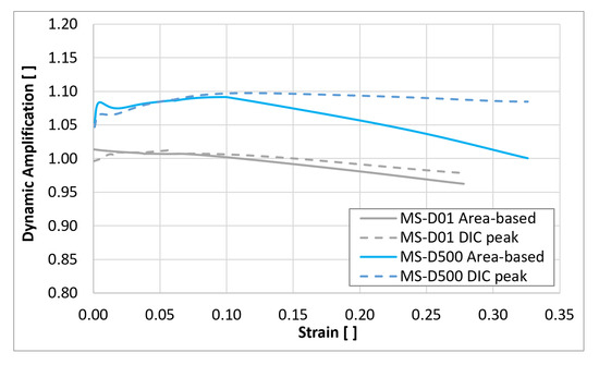 Figure 17 shows that within , the dynamic amplification is rather constant (just above 1% for the D01 tests and around 8% for the D500 tests); instead, beyond , as expected, the localized necking causes rapidly increasing local temperatures and the aforementioned thermal effects, so that the plots in Figure 17 cease to express an almost “undisturbed” dynamic amplification and start expressing a mixed effect of rate and temperature.