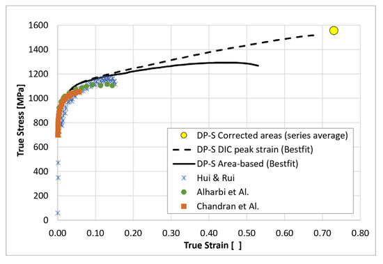 The effective corrected neck sections at failure from all tests can be then introduced in Equation (4), delivering a “corrected-area” failure point for each true curve.