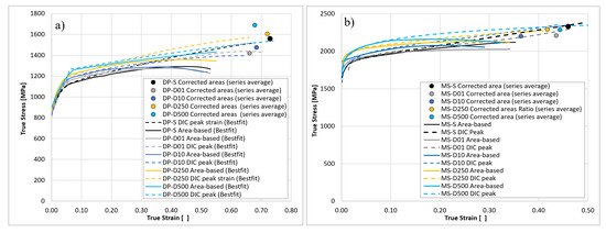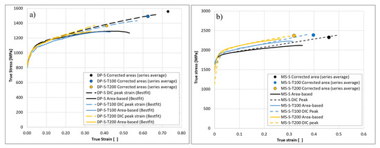 The area-based true curves and the DIC peak curves in Figure 16 are coincident to each other until for the DP1000 steel and for the MS1700 steel, roughly corresponding to the onset of the localized necking.