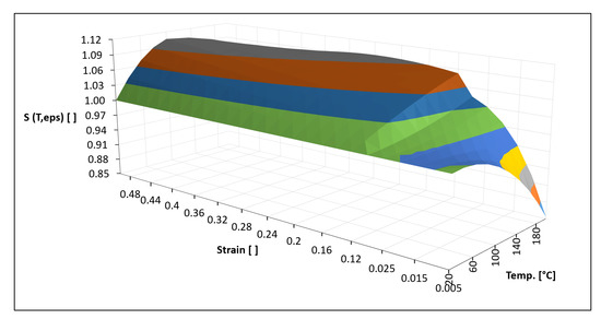 Metals subjected to temperature increase typically exhibit decreasing flow stress and lower stress–strain curves (thermal softening), although the opposite response of “negative softening”, proved in Figure 14b for the MS1700 steel, is also reported in the literature for other alloys [31,32,33,34,35].