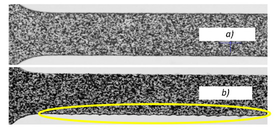 The scattering of the failure strains for the MS1700 steel in Figure 16 is quite larger than that of the DP1000 steel, which is mainly because of the remarkably different accuracy in the waterjet cutting of the respective specimens series. Figure 19 shows the details of two representative undeformed specimens of the DP1000 (a) and MS1700 (b) steels with DIC speckles: the former specimen does not exhibit imperfections detectable by the naked eye at the scale of the picture; instead, the latter shows a remarkably undulated lower edge encircled by the yellow line.