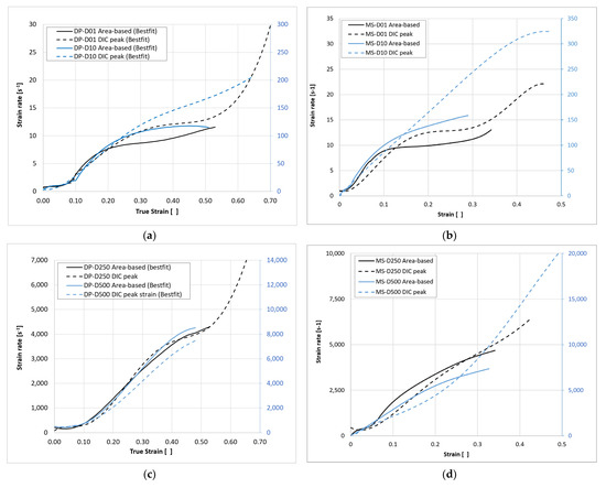 The strain rate histories of D1 and D10 tests are plotted together in Figure 20a,b for the two steels respectively, with primary and secondary vertical axes scaled to each other according to the same ratio 10:1 of the corresponding nominal rates. Similar considerations apply to the D250 and D500 tests, plotted in Figure 20c,d for the two steels respectively, where the scaling ratio of primary and secondary vertical axes is 2:1.