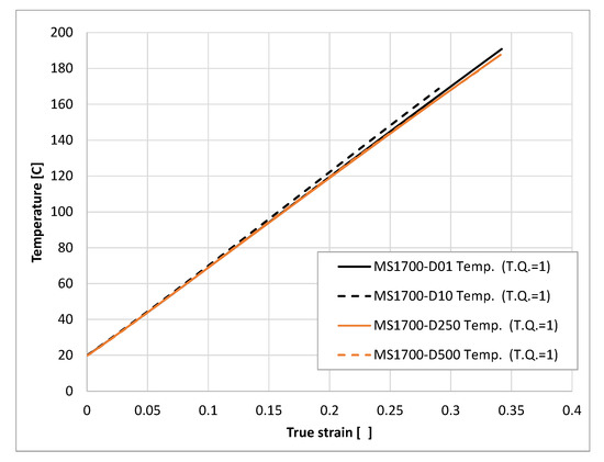 Recalling that dynamic tests also involve self-heating and that the hardening of the MS1700 steel is sensitive to the temperature, the question arises of whether or not any thermal effect should also be expected to show up in the true curves from dynamic tests of the MS1700 steel. Therefore, the temperature increase at the specimens’ neck is estimated by assuming fully adiabatic straining (slightly approximate for the D01 tests but appropriate for faster dynamic tests) and full conversion of plastic work into heat (unit value of the Taylor–Quinney coefficient). The von Mises stress obtained by the MLR necking correction of Equation (9) is used to integrate the plastic work, and the resulting temperature histories up to are plotted in Figure 21.