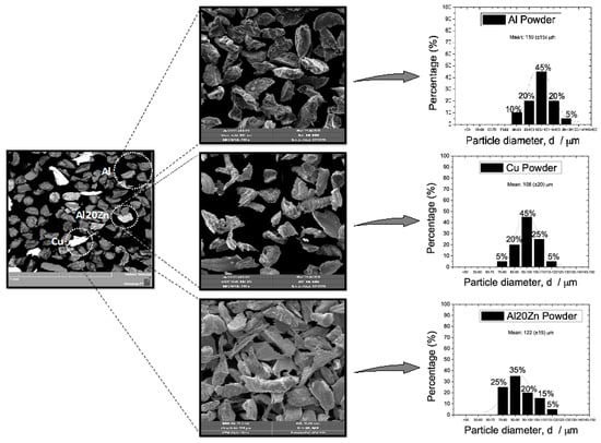 Typical SEM micrographs of the starting powders of Al, Cu and Al20Zn to compose the blend of Al6Cu5Zn alloy are shown in Figure 1. The regular shapes and rough surfaces of Al powders are observed. This is commonly expected when milled powders are produced. The Cu powders show irregular shapes but a lower rough surface than the Al powders. This seems to be intimately associated with the higher ductility of Cu than Al. The morphology surfaces of the Al20Zn particles are similar to those of Al powders. However, the powder particles demonstrate some deformation lines, which are characteristics remaining from the milling applied. A typical SEM image of the mixture of the three powders is shown in Figure 1. Similar powder sizes are clearly evidenced (i.e., a size ratio of 1:1, independent of the considered powder nature). Cu powder particles are easily identified since their particles are brighter than other particles. This is evaluated by observing the backscattering electron (BSE) images using SEM characterization.