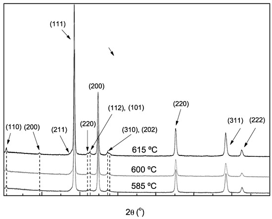 Since the highest UTS result is that of the range of the size particles between 200 and 140 mesh (75-106 μm), all other subsequent heat treatments adopted this size of particle. The sintering temperatures at 585 °C, 600 °C and 615 °C were carried out over 0.5 h. Typical XRD patterns are shown in Figure 2. Based on the experimental sintering temperatures, thermodynamic conditions for Al2Cu intermetallic material are expected, as previously reported [22,23]. In fact, this is confirmed when the reflection peaks corresponding to the Bragg planes (110), (200), (211), (220), (112) and (310) at angles of ~21°, 30°, 38°, 42°, 43° and ~47° were characterized (JCPDS file number # 01-1180). At angles of ~38°, 44°, 64°, 78° and ~83° corresponding to the crystallographic planes (111), (200), (220), (311) and (222), respectively, peaks appeared that are associated with Al (JCPDS #00-001-1180), as also previously reported [18,22,23]. Since the powders produced from the as-cast Al20Zn alloy were also used to create the AlCuZn samples at an angle of approximately 41.5°, an overlapped peak seems to be correlated with the Zn-based solid solution. Zn-based P63/mmc, space group number 194, with reference code 98-024-7160, as also reported by Gogola et al. [27]. At ~48°, another overlapped peak is associated with another plane (202) corresponding to Al2Cu.