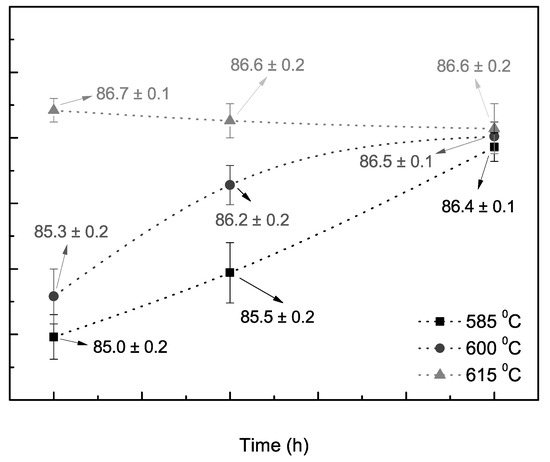 The densification values depend on both the sintering time and temperature, as confirmed in Figure 3. At a temperature range between 585 °C and 615 °C, in general, the densification increased with the increase in the sintering period. Using 0.5 h and 1.5 h of sintering, when a higher sintering temperature was provided, densification was increased. However, at 615 °C, when a higher liquid portion was promoted, a slightly decreasing trend in the densification was observed. In addition, when a sintering time of 3 h was used, the three examined samples had very similar densification levels, as depicted in Figure 3. A similar effect was also reported previously when Al/Cu composites were sintered [22]. It was also found that the porosity tended to decrease with the increase in the sintering temperature. This was associated with the liquid phase filling the pores and migrating into the remaining vacancies among the interfaces of the compacted powders. Lee and Ahn [3] reported that densification increased with increasing temperature, and the diffusion increased. Consequently, the coalescence among the particles increased, and the porosity decreased.