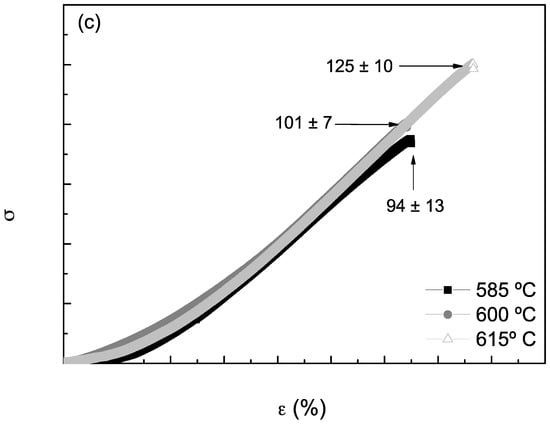 The experimental results of the engineering stress vs. strain of the Al6Cu5Zn samples created at three distinct sintering temperatures are shown in Figure 5. Additionally, three different sintering times are demonstrated, i.e., 0.5 h, 1.5 h and 3 h. At the first analysis, it can be seen that during the three sintering periods, the samples sintered at 600 °C and 615 °C exhibited similar mechanical responses. At 615 °C, when a sintering time of 0.5 h is analyzed, the obtained UTS is approximately 80 MPa, while after 1.5 h and 3 h, the UTS values are ~104 and 125 MPa, respectively. Additionally, it can be seen that with the increase in the sintering period, the UTS increased, i.e., ~23% from 0.5 h to 1.5 h and ~17% from 1.5 h to 3 h (from 80 to 104 MPa and from 104 to 125 MPa, respectively).
