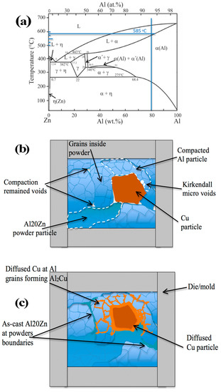 (a) Binary Zn-Al phase diagram; (b) schematic representation of the compacted and sintered powders at 585 °C; (c) evidence of the diffused Cu particles forming Al2Cu intermetallic constituents and the accommodation of liquid phase (as-cast) boundary powder particles.