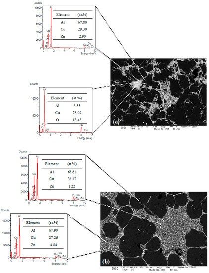 Typical SEM and EDX results of the Al6Cu5Zn alloy at: (a) 585 °C for 3 h, revealing distinct Al2Cu and Cu-rich regions, respectively; and (b) 615 °C for 3 h also evidenced a substantial region rich in Al2Cu (~65 and 70 wt % Al and ~24 and 28 wt % Cu contents).