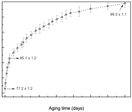 Figure 8 shows the variations in hardness with the aging of the Al6Cu5Zn alloy over 210 days. It is verified that during the initial 10 days, the hardness increased from ~77 to ~85 HV. This can be attributed to the formation of the GP zones precursor to the metastable phase, which undergoes gap-controlled diffusion, as reported by Ogura et al. [34]. This mechanism is possibly due to the high retention of gaps, promoted by the water-quenching that was used. In the case of an aging period longer than 120 days, the majority of solute precipitation has already occurred. A trend regarding stabilized hardness was observed, as shown in Figure 8. Similar behavior was also observed when the separate aging periods of an Al7050 alloy were investigated [35].