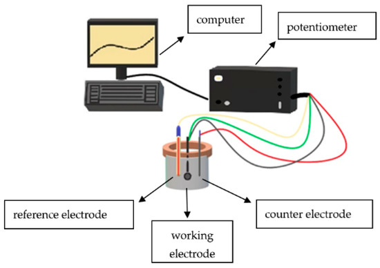 The Ecorr corrosion potential method, electrochemical impedance spectroscopy (EIS), and Tafel extrapolation method were used to obtain data on the corrosion behaviour of the samples. Electrochemical measurements were performed at room temperature (19 ± 2) °C using a potentiostat/galvanostat (Parstat 2273, manufacturer: Ametek, Leicester, UK) and a computer, which recorded the data during the measurement. The measuring apparatus consisted of a three-electrode glass cell (Figure 1).