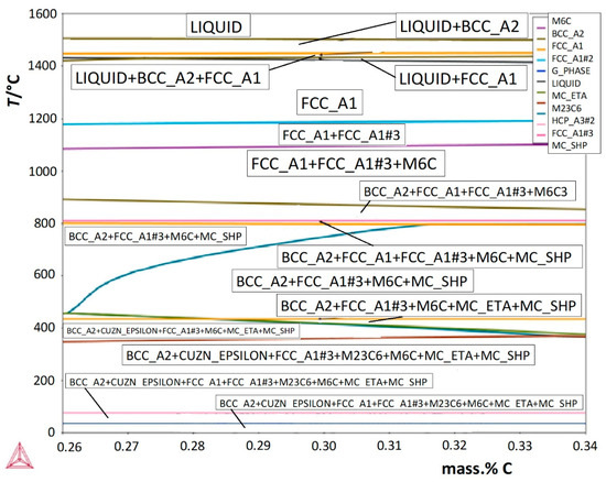Using the program Thermo-Calc and database TCFE 10, which works on the principle of the CALPHAD method, the phase equilibria were determined according to the choice of calculation conditions and the known chemical composition of tool steels [32,33]. According to a certain area, the temperatures and phases segregated at these temperatures were recorded from the phase diagram.