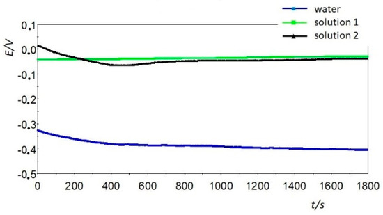 Time dependence of the open circuit potential of HTCS-130 tool steel in water, solution 1, and solution 2.