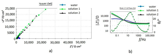 The comparative view of: (a) Nyquist’s EIS diagrams and (b) Bode plots obtained for HTCS-130 tool steel in water, solution 1, and solution 2.