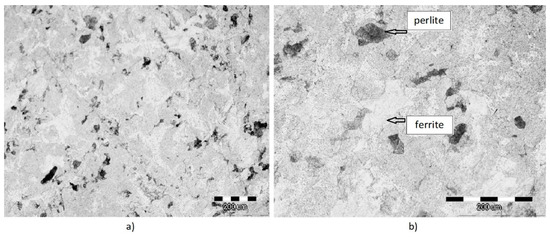 Metallographic analysis identified the ferrite-perlite structure. The structure of ferrite is highlighted in white and perlite in a darker colour [26,27,39]. The tested steel is characterised by high purity and a fine homogeneous structure. Moreover, the samples were recorded using scanning electron microscopy and analysis was performed using an energy dispersion spectrometer (Figure 8).