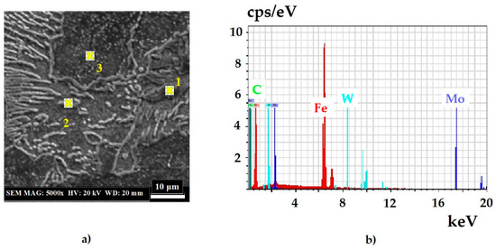 (a) SEM micrograph of the HTCS-130 hot work tool steel surface after etching in nital (magnification 5000×), (b) example of EDS analysis of position number 2.