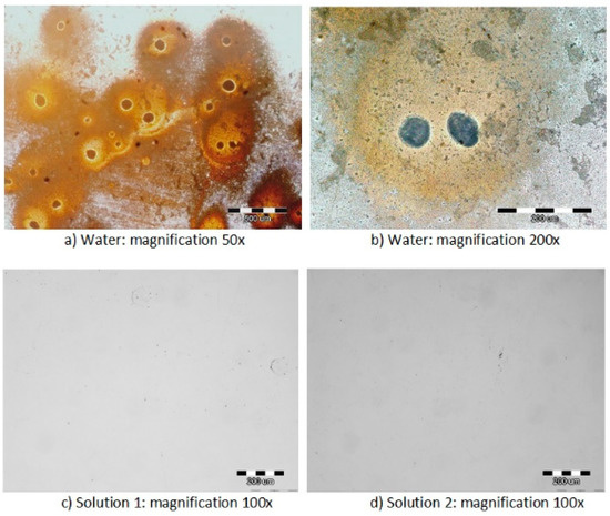 An accumulation of corrosion products was observed on the sample only exposed in water. According to the appearance of corrosion damage, the assumption is that it is pitting corrosion caused by the decomposition of a passive corrosion film that is not compact enough to be rebuilt [9,14,34,35]. Small anode sites corrode rapidly due to a lack of oxygen to protect the entire surface. As a result, potential differences are created between the metal surface and within the pits. The accumulation of aggressive ions from the solution is a problem, as greater destruction of the material can occur. The surface of the sample after the electrochemical tests in water with the addition of inhibitors remained unchanged. The inhibitor agent left a very thin transparent, dry film on the metal surface. The inhibitor concentrate used was formulated on the basis of thixotropic calcium sulfonate inhibitors. Calcium sulfonate is used as a thickener in the food and packaging industry. It is used as a protective layer against the formation of corrosion products.