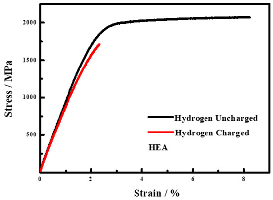 Stress-strain curves of Al0.5Cr0.9FeNi2.5V0.2 obtained by SSRT tested at room temperature with and without hydrogen charging.