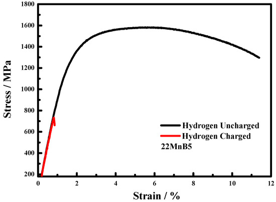 Stress-strain curves of 22MnB5 steel obtained by SSRT, tested at room temperature with and without hydrogen charging.