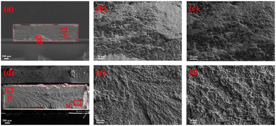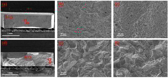 Fracture morphology of 22MnB5 steel tested at room temperature with and without hydrogen charging: (a) uncharged and (b,c) magnified region of red frame in (a), respectively; (d) hydrogen-charged and (e,f) magnified region of red frame in (d), respectively.
