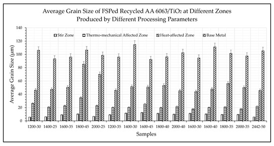 - The microstructure of the FSPed recycled AA6063/TiO2 sample that was produced at 2442 rpm and 50 mm/min exhibits the most uniform distribution of TiO2 and it also achieves the greatest reduction of grain size.