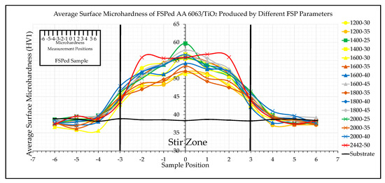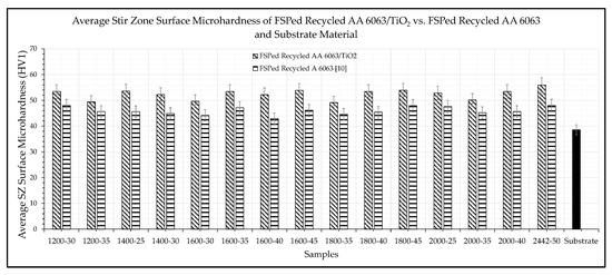 - The highest surface microhardness is achieved by the FSPed recycled AA6063/TiO2 sample produced at 2442 rpm and 50 mm/min: 55.6 HV1. This surface microhardness is 16% higher than FSPed recycled AA 6063 and 45% higher than the substrate material.