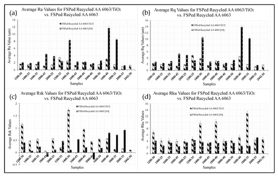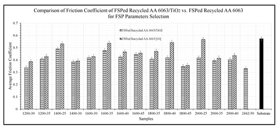 - In short, the most suitable processing parameters used in this study for the fabrication of FSPed recycled AA 6063/TiO2 are 2442 rpm and 50 mm/min. These parameters produced the sample with the highest surface microhardness, and lowest wear rate and friction coefficient. However, further study is needed to investigate the effect of rotational speeds and feed rates that are higher and lower than 2442 rpm and 50 mm/min for enhancing tribological performance of FSPed recycled AA 6063/TiO2 surface composites.