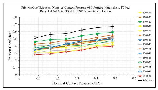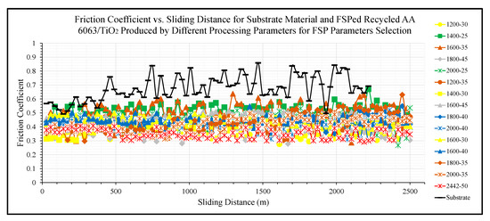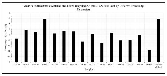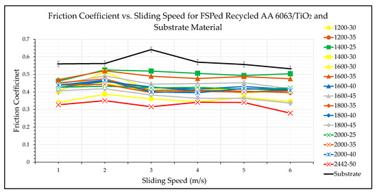 - The FSPed recycled AA6063/TiO2 sample produced at 1200 rpm with 30 mm/min, 1800 rpm with 45 mm/min and 2442 rpm with 50 mm/min give relatively low friction coefficients, while only the sample produced at 2442 rpm and 50 mm/min has the lowest friction coefficient and wear rate. This sample has an average friction coefficient of 0.33 and a wear rate of 0.43 × 10−5 gN−1m−1. This result reduced the friction coefficient and wear rate of the substrate by 39% and 73%, respectively.