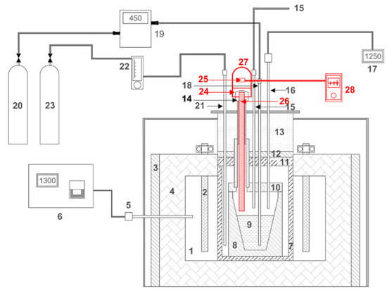 Experimental system for the conversion experiments. 1. Reaction chamber. 2. SiC resistors. 3. Thermal insulation. 4. Refractory bricks. 5. Control type S thermocouple. 6. Controller. 7. Security crucible. 8. Working crucible. 9. Molten bath. 10. Working cover. 11. Safety cover. 12. Thermal insulation. 13. Furnace cover. 14. White metal feeding. 15. Gas outlet line. 16. Thermocouple. 17. Temperature reader. 18. Process gas (air) injector. 19. Mass flowmeter. 20. Air cylinder. 21. Nitrogen injector. 22. Rotameter. 23. Nitrogen cylinder. In red, the unit for capturing the sound of the bubbles supplied to the molten medium installed in the crucible furnace. 24. Thermal insulation. 25. Hands-free microphone. 26. Steel tube. 27. Chamber of amplification. 28. Electronic sound recording device.
