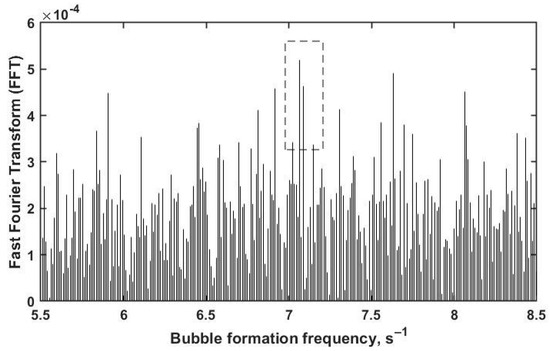 Based on the frequency measurements, the total number of bubbles fed during the conversion experiments was determined, which is directly related to the total reaction surface in the system. Andreini et al. [16] used a technique to record sounds on the surface of the metal bath to quantify the bubbles delivered to the molten medium. From preliminary tests based on the supply of air under room temperature and pressure conditions in different media (water, oil and honey), it was determined that the high amplitude wave signals corresponded to the bursting of the bubbles during their detachment from the injector, while the low amplitude wave signals were associated with the sound emitted by the bursting of the bubbles on the surface of the metal bath. Bubbles were quantified using two criteria. First, the manual counting of bubbles when the playback speed of the captured audio was slowed down, thereby defining the most appropriate periods to process higher quality audio signals. The second criterion was the quantification of the bubbles in the time interval of the previous criterion, using the Fast Fourier Transform (FFT), which allows continuous digital audio signals to be transformed into discrete signals, and in this way differentiate the characteristic frequency or frequency of bubble formation from the total signal captured. The analysis using this tool allows identifying the representative frequency of the captured signal from the highest maximum FFT value in the range of values tested, which is highlighted in Figure 3 by means of a segmented rectangle.