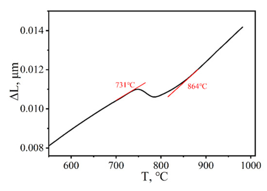 Points of phase transformation: The phase transition point of the tested steel was measured by the DIL 805 A/D dilatometer. Figure 1 is the expansion curve of the sample during continuous heating. Ac1 is the start temperature of austenite transformation, and Ac3 is the finish temperature of austenite transformation. The transformation point Ac1 of the tested steel measured by the tangent method is 731 °C, and the Ac3 is 864 °C. The specimens were heated to 950 °C at a heating rate of 10 °C/s using a DIL 805 A/D dilatometer and held for 30 min, then rapidly cooled to 890 °C, 870 °C, 860 °C, and 848 °C, respectively, for 30 min in a vacuum with 30 °C/s. After that, the specimens were cooled to room temperature at a colling rate of 30 °C/s. Finally, after the Ms of the test steel was determined, a bainitic austempering temperature of 320 °C was selected.