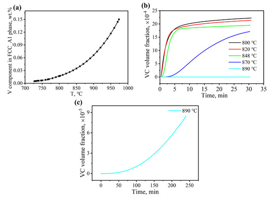 (a) V component in the austenite phase with the increase of the austenitization temperature; (b) and (c) Relationship between VC volume fraction and time.