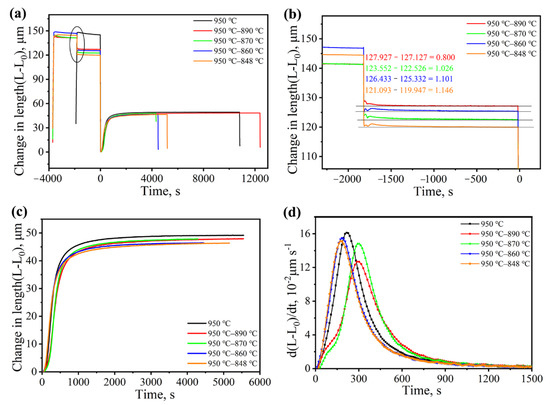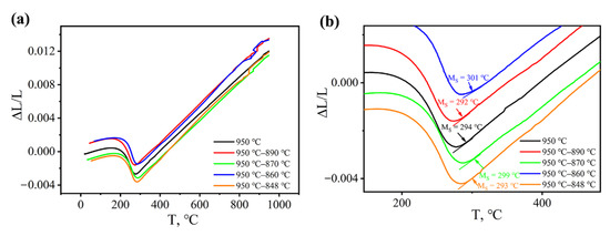 (a) Temperature–expansion curves at different austenitization temperatures; (b) Enlarged figure of (a) located at the transformation point.
