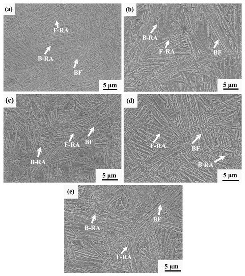 SEM micrographs of specimens with different heat treatment processes. (a) 950 °C; (b) 950 °C–890 °C; (c) 950 °C–870 °C; (d) 950 °C–860 °C; and (e) 950 °C–848 °C. (BF: bainitic ferrite; F-RA: film retained austenite; B-RA: blocky retained austenite).