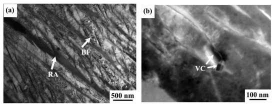 The precipitations of V play a role in precipitation strengthening and grain refinement strengthening in steel [16]. The research of Nafisi’s team has shown that fine VC particles formed by adding 0.06 wt% V could increase yield and tensile strength of 60–95 MPa without losing toughness and ductility [17]. Wang found [18] that the addition of V can widen the bainite phase region during continuous cooling. Furthermore, the addition of fine VC precipitations with a mass fraction of 0.06% can increase the yield strength and tensile strength by 60 MPa and 95 MPa, respectively, without decreasing the toughness and ductility [19]. Karmakar’s team prepared two V-containing steels, high C with low N and low C with high N. At moderate isothermal holding temperatures (600–650 °C), the largest amount of fine V (C, N) precipitated phase was found in both steels. The V precipitations of the low C with high N steel are finer, which can offset the strength reduction caused by unfavorable factors such as microstructure coarsening [19]. It is shown that V (C, N) precipitation makes dislocation entanglement recovery difficult [20]. V-containing steels have a high proportion of low- and medium-angle grain boundaries and a small bainite grain size [21]. Garmeh et al. showed that the addition of vanadium to silicon-containing medium carbon steel is helpful to the formation of carbide-free bainitic ferrite. At the same time, the addition of vanadium increases the grain size of primary austenite and the content of retained austenite. In the process of transformation induced plasticity, retained austenite transforms into martensite, which leads to the improvement of tensile strength and fracture toughness [22]. The introduction of V microalloying in bainitic steels has a positive effect on strength. Therefore, it is important to study the effect of V precipitations on the bainite transformation and the relationship between the microstructure and mechanical properties.