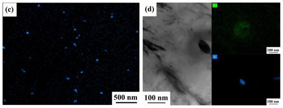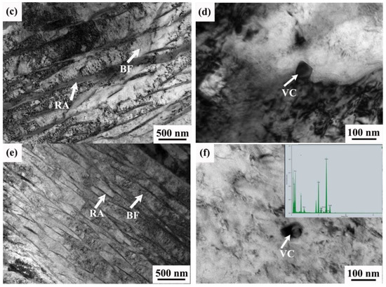 Energy spectral analysis of the microstructure for specimens treated at 950 °C–870 °C and 950 °C–848 °C revealed carbide precipitation, as shown in Figure 7. Precipitation of V is observed, as shown in the inset image. The TEM characterization was carried out to further observe the microstructure, morphology, and volume fraction of V precipitation.