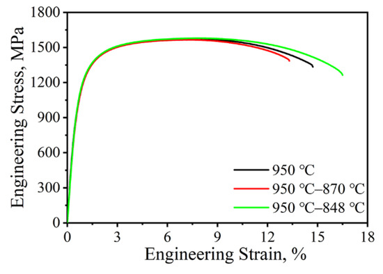 The detailed mechanical properties of these three specimens are presented in Table 1. The engineering stress–strain curves are shown in Figure 11. It can be seen that the impact toughness of the tested steel under the 950 °C–870 °C treatment is the highest, reaching 72 J/cm2. The tensile strength, yield strength, elongation, impact toughness, and hardness of the steel subjected to 950 °C–848 °C treatment were 1579 MPa, 1108 MPa, 15.9 %, 50.5 J/cm2, and 46.5 HRC, respectively. Compared with the specimens treated at 950 °C–870 °C with a lower amount of VC precipitations, the strength, hardness, and elongation of the specimens treated at 950 °C–848 °C were slightly increased and the impact toughness was reduced. In general, the addition of a certain amount of VC precipitations improves the comprehensive mechanical properties of the tested steel.