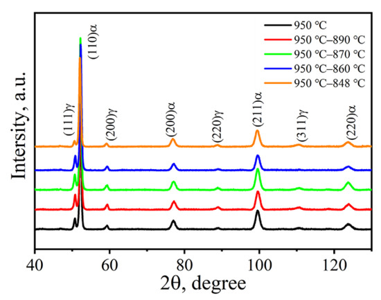 XRD analysis of all the DIL specimens after high-temperature two-step isothermal treatment was performed to study the phase composition, as shown in Figure 12. There are only ferrite and retained austenite according to XRD curves, therefore, the volume fraction of retained austenite can be calculated by using the formula in [29]. The volume fractions of the retained austenite are listed in Table 2. As the isothermal temperature decreases from 950 °C to 848 °C, the volume fraction of retained austenite firstly increases and then decreases. The reasons for the evolution of retained austenite volume fraction are as follows. When the specimen is isothermal at 950 °C, a large number of V atoms are dissolved in the matrix, while the effect of VC particles on grain boundary pinning is not obvious. Therefore, the transformation of austenite to bainitic ferrite is easy, resulting in the decrease in volume fraction of retained austenite. When the isothermal temperature decreases, the precipitation of VC particles increases. The formation of VC particles in the microstructure reduces the carbon content in the undercooled austenite and makes the undercooled austenite unstable. Therefore, the undercooled austenite is easy to transform into bainitic ferrite. However, at the same time, the degree of grain boundary pinning caused by more VC particles of the low-temperature isothermal specimen is relatively higher than that of the high-temperature isothermal specimen. Consequently, the transformation of supercooled austenite to bainitic ferrite is difficult. The latter is the crucial factor in the above mentioned two factors affecting the transformation fraction of undercooled austenite, eventually leading to an increase in the volume fraction of retained austenite. The amount of VC particles increases with the further decrease of isothermal temperature; thus, the carbon content in retained austenite continues to decrease. Moreover, the pinning effect of small VC particle is relatively smaller. As a result, the undercooled austenite is easy to transform to bainitic ferrite, and the volume fraction of retained austenite decreases.