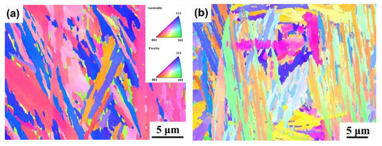 EBSD analysis was carried out to further analyze the difference in the misorientation angle of the specimens after different heat treatment processes. Inverse pole figure (IPF) and misorientation angle distributions of the specimens are shown in Figure 13. The proportion of the misorientation angle less than 5° of the 950 °C–848 °C treated specimen is large. The low-angle grain boundaries with very small misorientation angles (<5°) are regarded as substructures existing in the grains, which is beneficial to the improvement of strength [30,31]. In contrast, the proportion of low-angle grain boundaries of 950 °C–870 °C treated specimen is small, while that of high-angle grain boundaries is large. Studies have shown that high-angle grain boundaries between bainite can hinder crack propagation or change crack propagation direction, which can improve the toughness of specimens [32,33]. Therefore, the 950 °C–870 °C treated specimen exhibits high impact toughness.