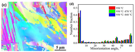IPF maps ((a) 950 °C; (b) 950 °C–870 °C; and (c) 950 °C–848 °C) and misorientation angle distributions (d) of the samples after high-temperature two-step isothermal processes.