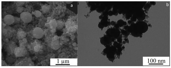 The Al-5Mg (Al—95 wt.%, Mg—5 wt.%) alloy was used as an initial alloy. Tungsten powder, obtained by the electrical explosion of a conductor, was used as strengthening particles. Figure 1 shows the scanning electron microscopy (SEM) (Figure 1a) and the transmission electron microscopy (TEM) (Figure 1b) images of W nanoparticles.
