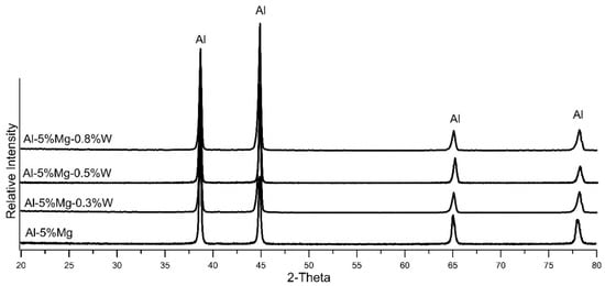 The microstructure of the initial Al-5Mg alloy is made up of equiaxed grains with an average size of 180 μm. The introduction of 0.3 and 0.5 wt.% W does not lead to a significant decrease in the average grain size, which was 164 and 149 μm, respectively. However, an increase in the content of W nanoparticles in the Al-5Mg alloy to 0.8 wt.% leads to a decrease in the average grain size to 95 μm. It is known that grain refinement in aluminium alloys is possible due to the nucleation and inhibition of grain growth during melt solidification [30]. The formation of new solidification centres requires the formation of a phase with a coherent structure, on which further grain growth is possible. For the Al-W system, the Al12W intermetallide can act as a solidification centre, but according to the data of X-ray diffraction (XRD) analysis (Figure 3), this phase cannot be identified.