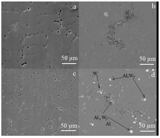 The SEM image of Al-Mg alloys: (a) Al-5Mg, (b) Al-5Mg-0.3W, (c) Al-5Mg-0.5W, and (d) Al-5Mg-0.8W.