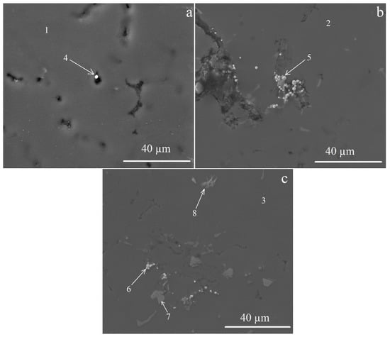 In the microstructure of the Al-5Mg alloy, there are inclusions of pores with a size of no more than ~1 µm (Figure 4a). At the same time, the alloy microstructure is quite uniform, without a visible accumulation of pores. The introduction of 0.3 wt.% W did not lead to a significant change in the microstructure compared to the initial alloy, and no accumulation of nanoparticle agglomerates was observed in the microstructure (Figure 4b). A deeper analysis of the microstructure makes it possible to reveal individual particles of tungsten in the Al-5Mg-0.3W alloy, which are displaced into pores due to the movement of the solidification front during the cooling of the melt (Figure 5a, Table 1). An increase in the W content to 0.5 wt.% does not lead to a change in the microstructure of the alloy at magnifications of up to ×1000 (Figure 4c). However, at high magnifications, both individual W particles and their agglomerates can be observed, which are located in the volume of grains and interboundary regions (Figure 5c, Table 1).