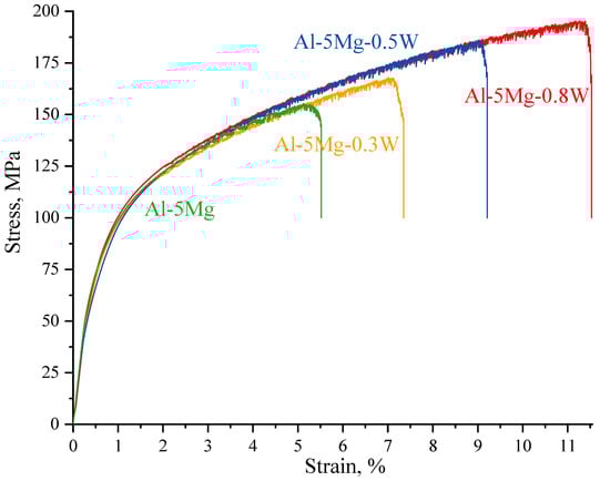 It can be seen from the stress–strain curves for the alloys obtained (Figure 6, Table 2) that the introduction of tungsten nanoparticles into the alloy leads to a simultaneous increase in the Al-5Mg alloy yield strength and ductility.