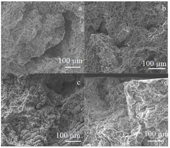 SEM images of the Al-Mg alloy fracture surface: (a) Al-5Mg, (b) Al-5Mg-0.3W, (c) Al-5Mg-0.5W, and (d) Al-5Mg-0.8W.