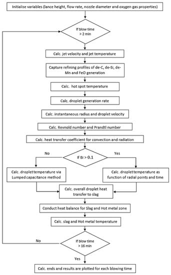 The droplets interact with the different surrounding mediums at different stages of the blowing period. In the initial phase of the blow, generated droplets from the hot spot travel through the gaseous atmosphere and fall back into the hot metal bath. During the mid-blow, the droplet travels through the emulsion zone, undergoing refining action. Once the blowing proceeds towards the final stage, the interaction of droplets will be limited to the slag phase. Therefore, it is required to understand how the large number of droplets generated at different stages of the blowing period undergoes heat transfer with the surrounding medium. However, the complexity linked with the global heat transfer model is attributed to transient parameters, such as droplet velocity, size, density, generation rate, CO formation, CO escape, size distribution, internal heat generation, emissivity, residence time, mass transfer, thermal properties of the medium surrounding the droplet, hot spot temperature and heat transfer coefficients, due to convection and radiation. To tackle this problem, a systematic approach is needed. The complexity of the problem is considered by dividing it into different modules. The methodology used for this research is represented using a flow chart as shown in Figure 1 and the algorithm for the model is given in Figure 2.