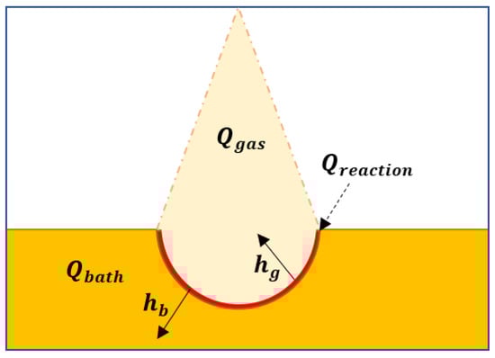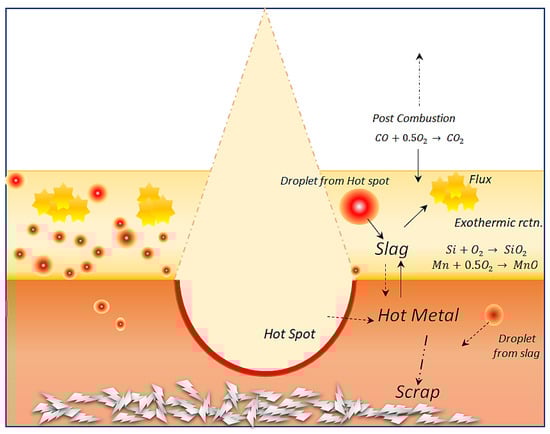 The point where the supersonic jet impinges the hot metal bath generates high heat, resulting in the maximum temperature inside the furnace. A typical hot spot temperature reported from different studies ranges from 1850 K to 2500 K [36,37,38,39]. As the droplets are generated from the hot spot zone, the initial temperature of the droplet will be the same as the hot spot temperature. A recent study by Rout et al. [1] has computed the refining profiles at the hot spot zone using Ciccutti’s plant data [23]. In the present study, the temperature of the hot spot is calculated using Equation (16), considering the predicted refining profile by Rout et al. [1]. At the hot spot, the heat generation Qreaction is contributed by decarburization, silicon oxidation, and iron oxidation reactions. Simultaneously, the heat is transferred to the bath (Qbath) and flue gas (Qgas) side from the hot spot zone, as shown in Figure 3. Therefore, the heat balance can be written as the following equation: